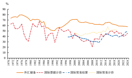 图1 美元国际化指标走势 数据来源:外汇储备货币份额数据来源于国际货币基金组织国际货币构成(IMF COFER)数据库、国际票据计价份额数据来源于国际清算银行(BIS),国际贸易结算份额数据来源于Wind,国际贸易计价份额来源于IMF工作论文(Boz et al.,2020) |