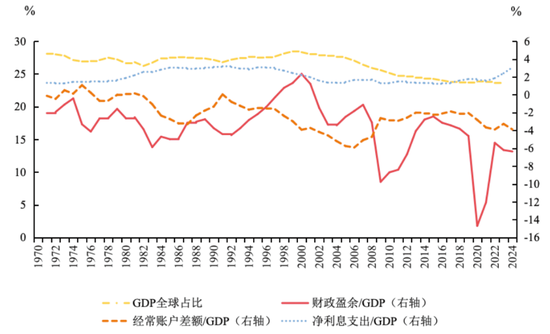 20世纪70年代之后,随着美国制造业外移和日欧产品供给能力的提升,美国开始通过贸易逆差提供美元流动性。布雷顿森林体系解体后,美国开始推动资本账户自由化,实现金融渠道的美元回流,从而形成“经常账户逆差输出+资本账户顺差回流”的新型美元环流。随着苏联解体和东欧剧变,原苏联国家开始拥抱美元体系,中国加入世界贸易组织(WTO)后,与美国的经贸关联显著加强,“中心—外围”结构形成并不断强化。在“中心—外围”结构下,美国通过经常账户逆差输出美元的模式得到进一步强化,导致全球失衡加剧,美国贸易逆差扩大,政府债务赤字也不断增长。在这一模式下,美国想要稳住美元国际地位,就需要提供足够的美元流动性,需要越来越大的贸易逆差,需要承担越来越大的债务和利息负担。目前美国经济已经进入稳态增长阶段,年均GDP增速稳定在3%左右,而随着美国债务的不断攀升,美国事实上负担债务利息的能力正在减弱。新“上位者诅咒”正在对美元地位形成强力约束。